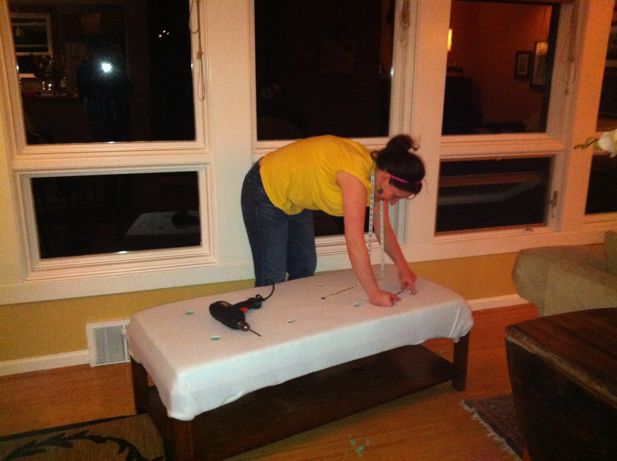 We bought 2 inch foam, fleece fabric and buttons from JoAnn’s. All together the supplies cost about $60. We cut the foam with a bread knife to fit the top. We marked where we wanted the buttons to go and drilled holes in the top of the table. Then we stapled a fleece lining around the foam to the underside of the table.