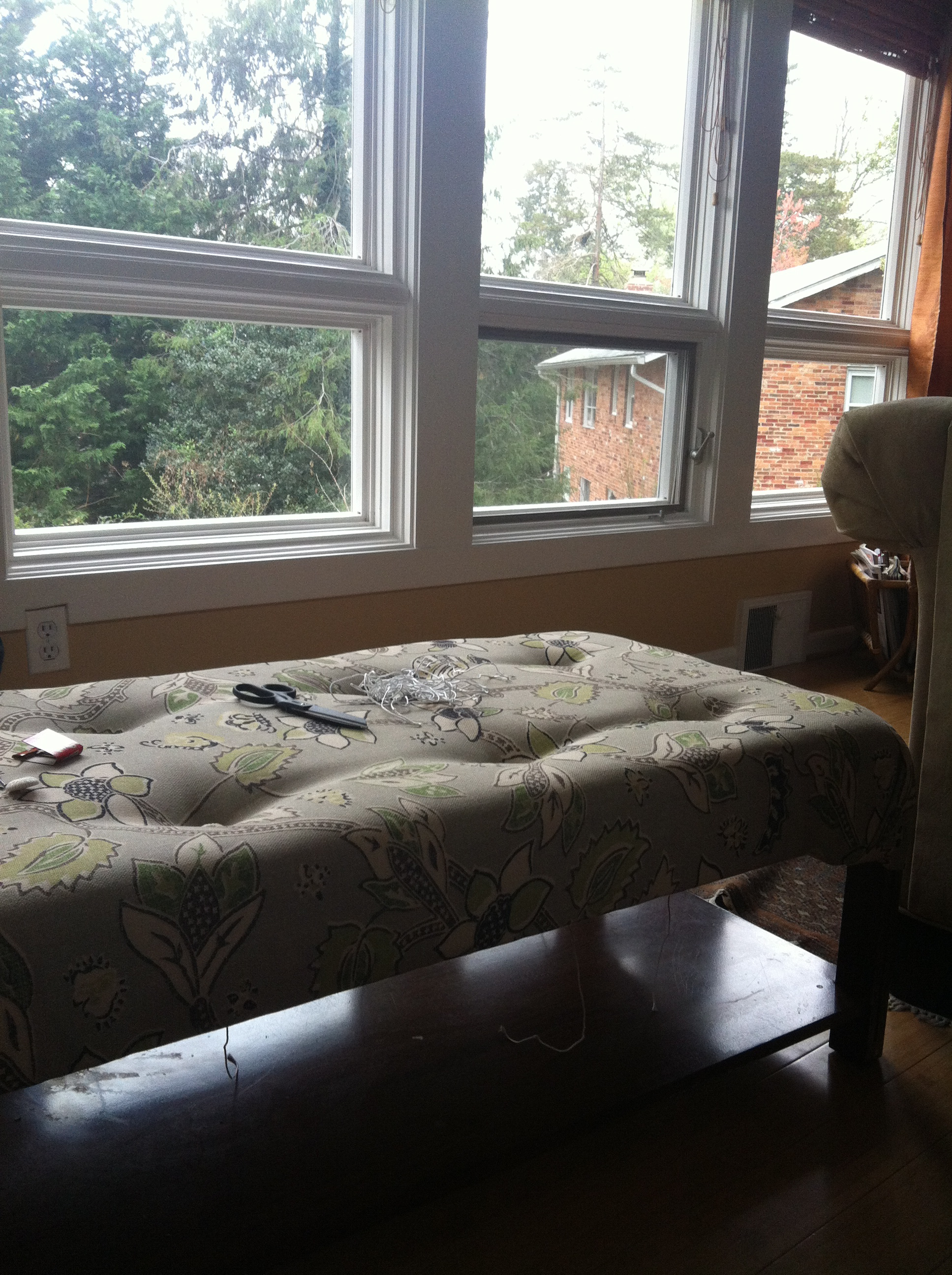 I brought the cord back through the fabric and tied one end to a nail. Then we pulled it tight and retied the knot so it would not go back through the hole. This created a tufted top on the ottoman. We did this eight times.