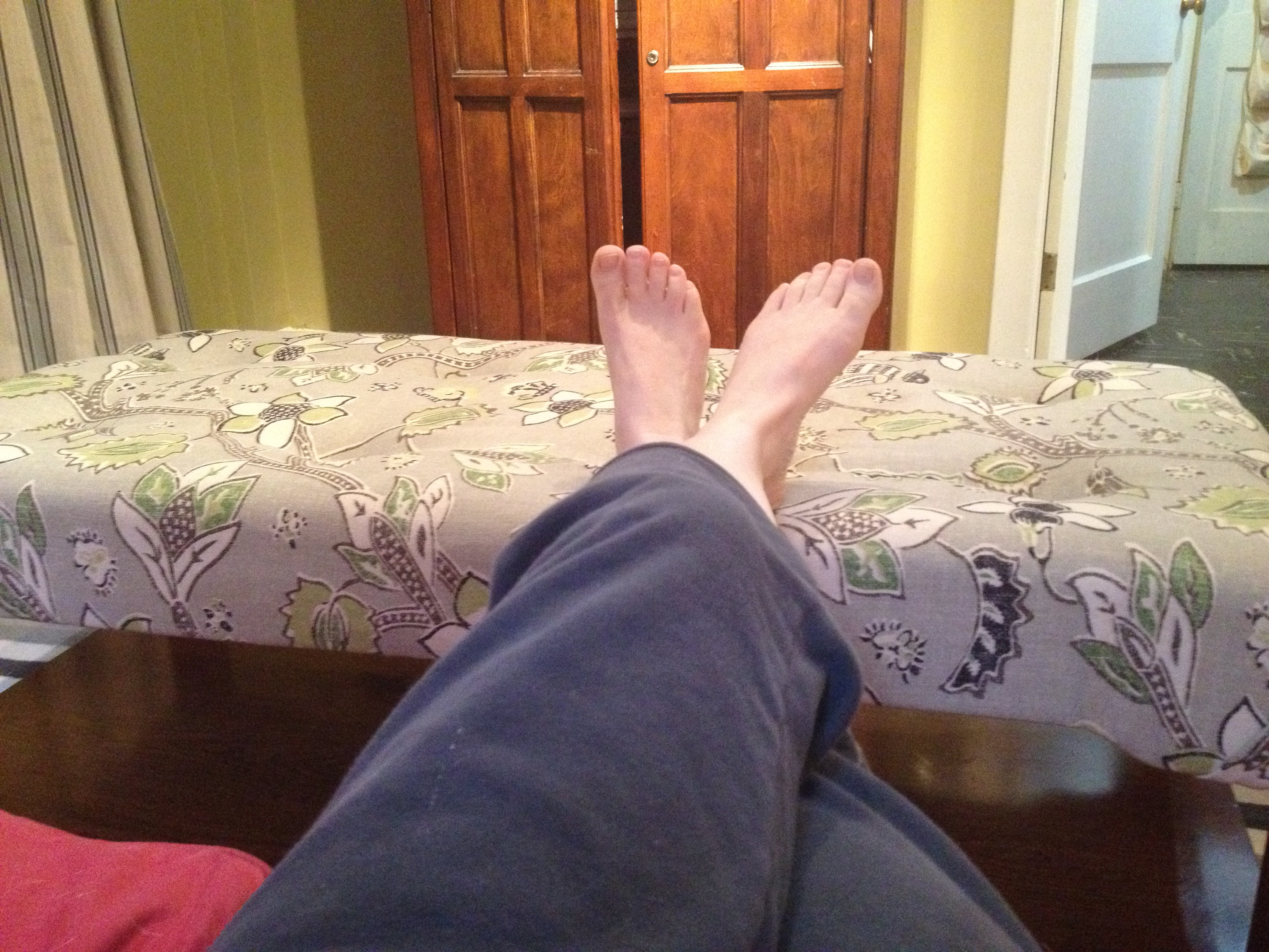 This is me in my pajamas working on it. It was helpful to have Angela there to push on the button so the tuft was really tight. She only has a few bruises.