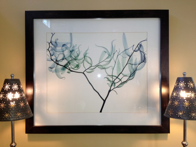 I have balanced the “Great Wall of Beltsville” with a single large photograph across the room. It is a way to add calm and to quiet the room. The scale of it alone commands attention and the x-ray plant radiates some sort of photosynthesis–chic.
