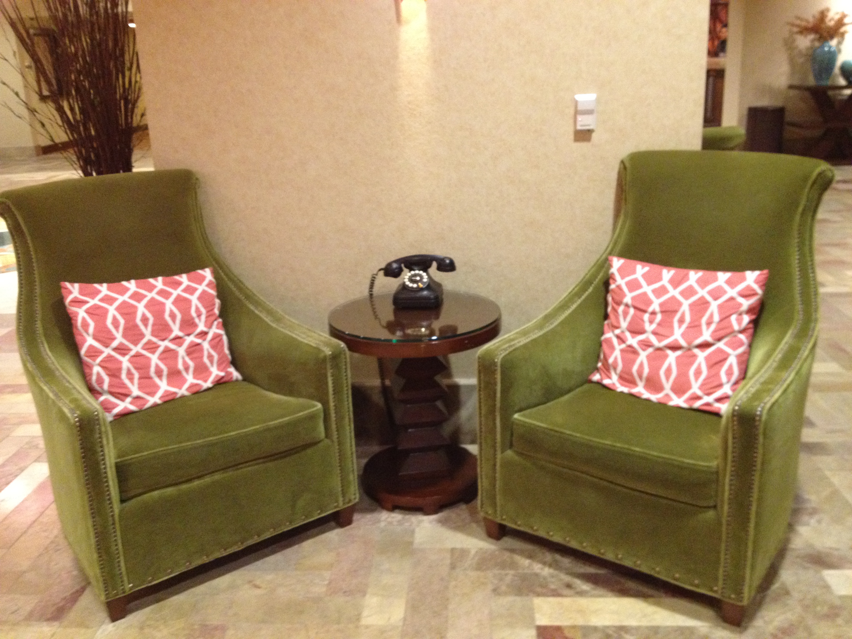 I love those green chairs. The pillows remind me of a pair I picked up at Target. Same color and a similiar design.