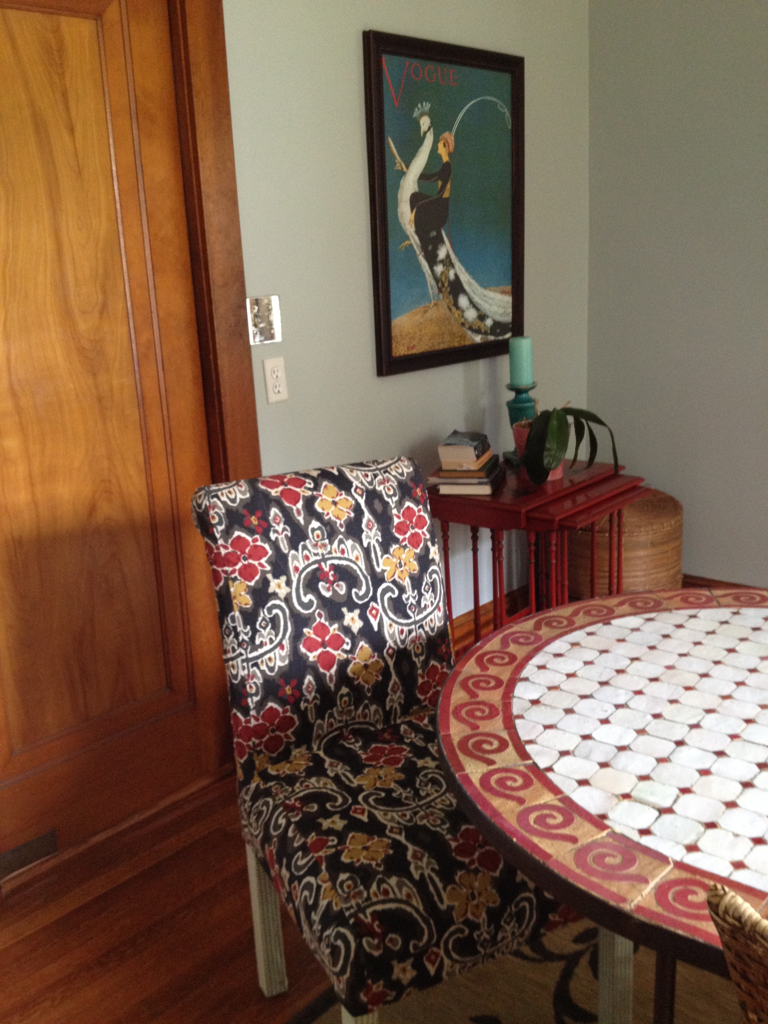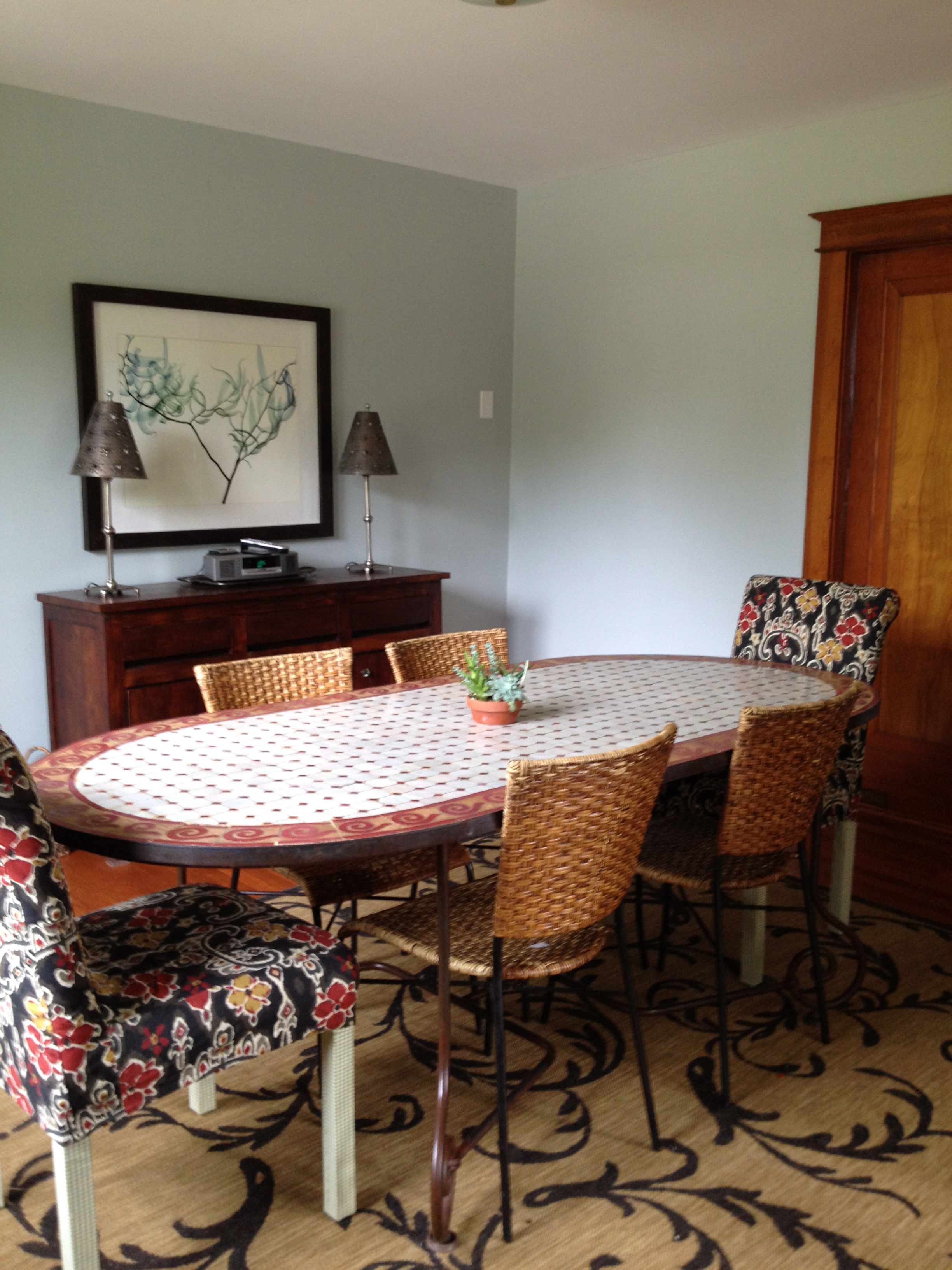 My wicker dining room chairs have lasted for twelve years and through several children who used to pick at them when they were in time out. The chairs refuse to wear out. I wish they would so I could justify pitching them. Rather than throw out perfectly good chairs, I decided to just give the cloth chairs on the ends a face-lift with new slipcovers. This changed the look of the whole room!