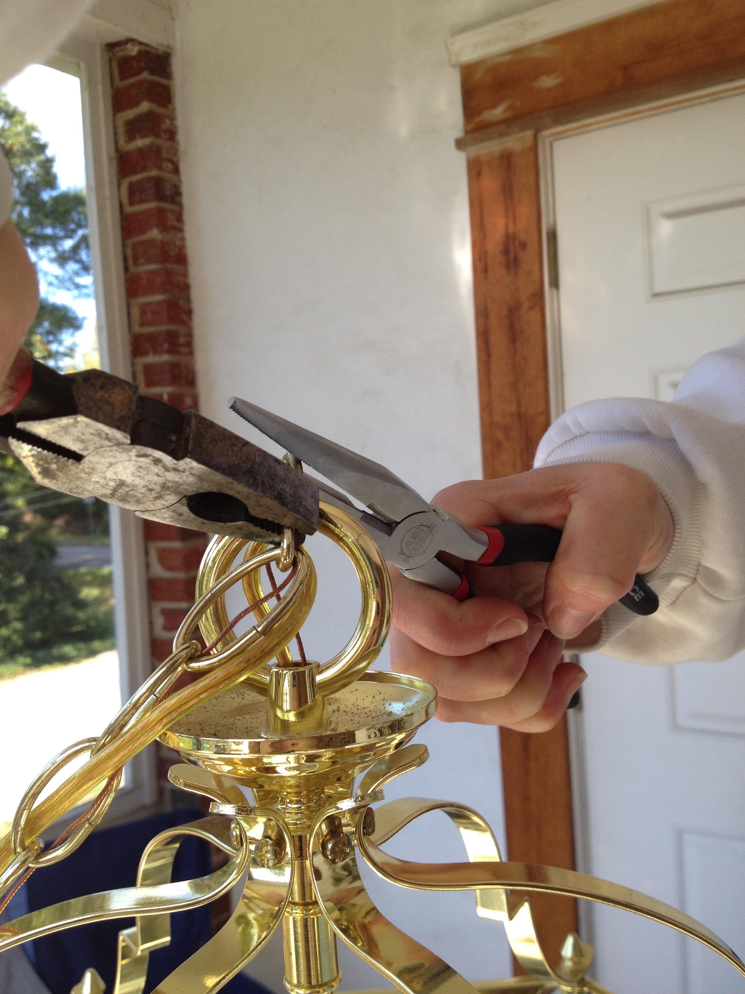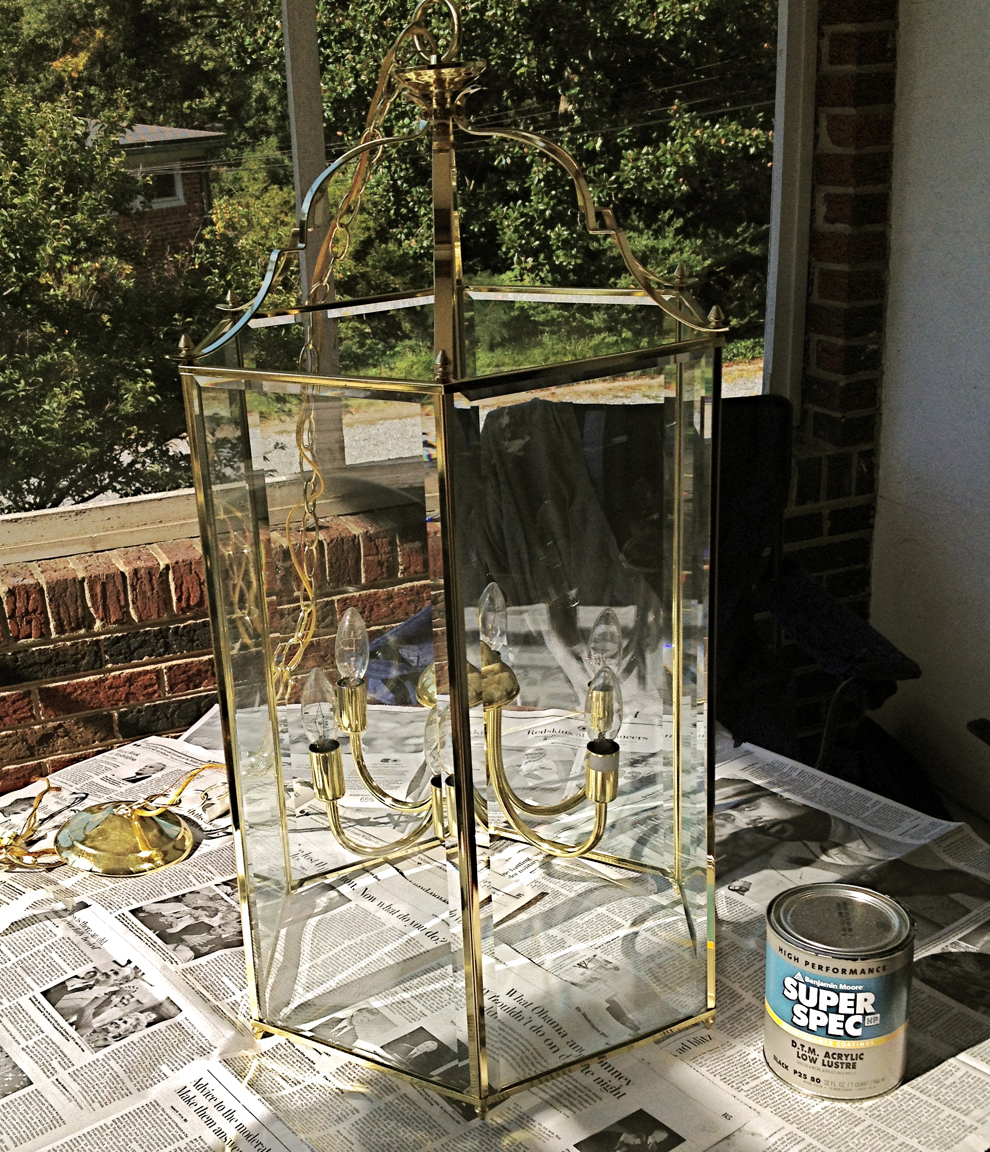 I eventually found one that was perfect, although not exactly. I had to transform it from it’s original brass finish before it would be perfect. It was a lantern that would capture the feel I was going for. It was hexagon-shaped, oversized with delicate lines and would do nicely in my dining room. I rescued it from Community Forklift. It cost $119.