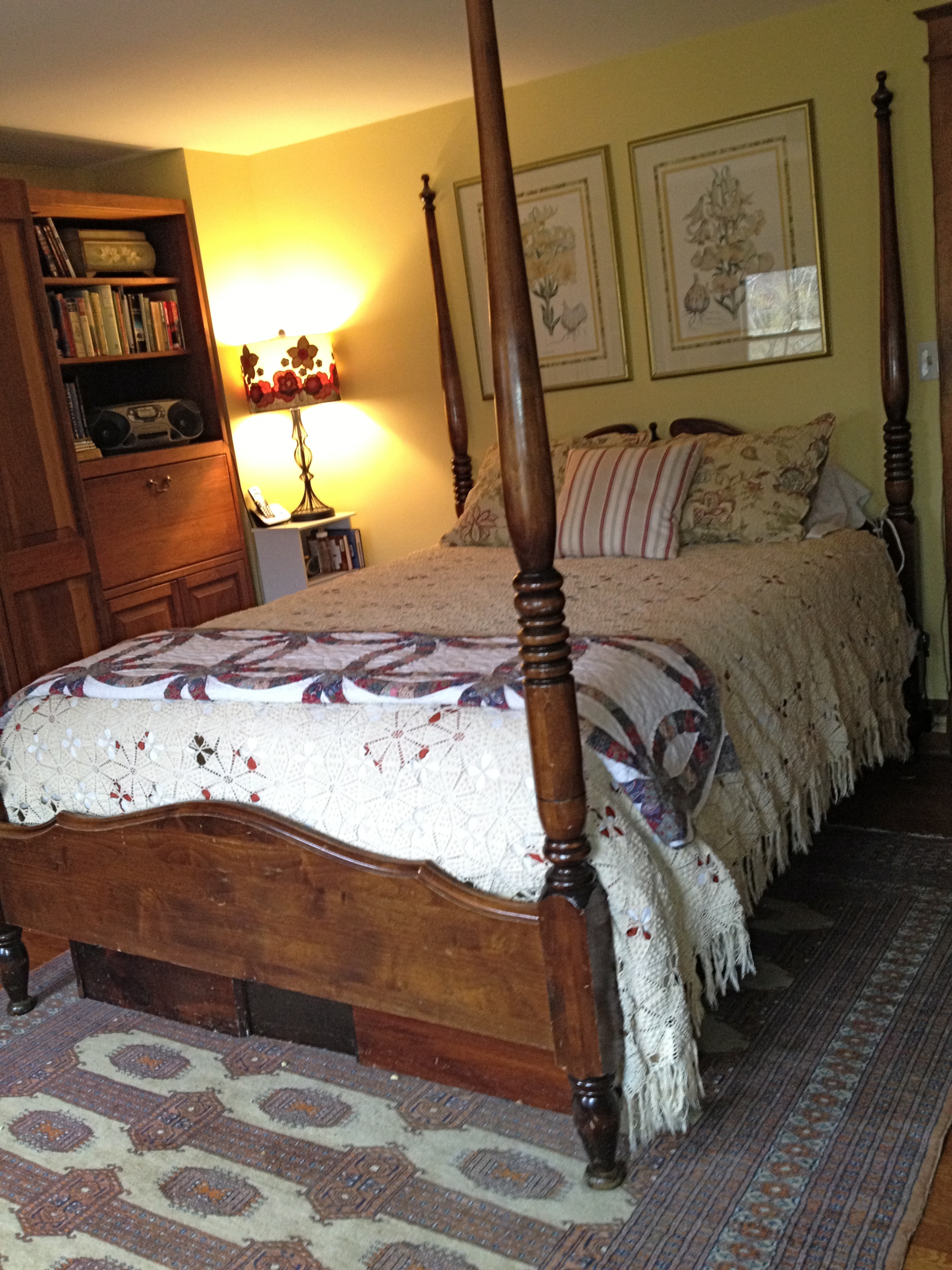 As the weather gets chilly, I thought a few simple tips to “winterize” your boudoir were in order. Add a quilt or throw to the foot of the bed. This will make it feel warm and inviting. Throw an old piece of sheepskin or anything furry to add a bit of fuzzy texture. I did this on the red reading chair. Ignore that bright overhead light and add lamps for a softer light that is good for reading… and any other bedroom activities that come to mind. A rug on the floor is crucial and will make the room feel cozy and warm under your feet.