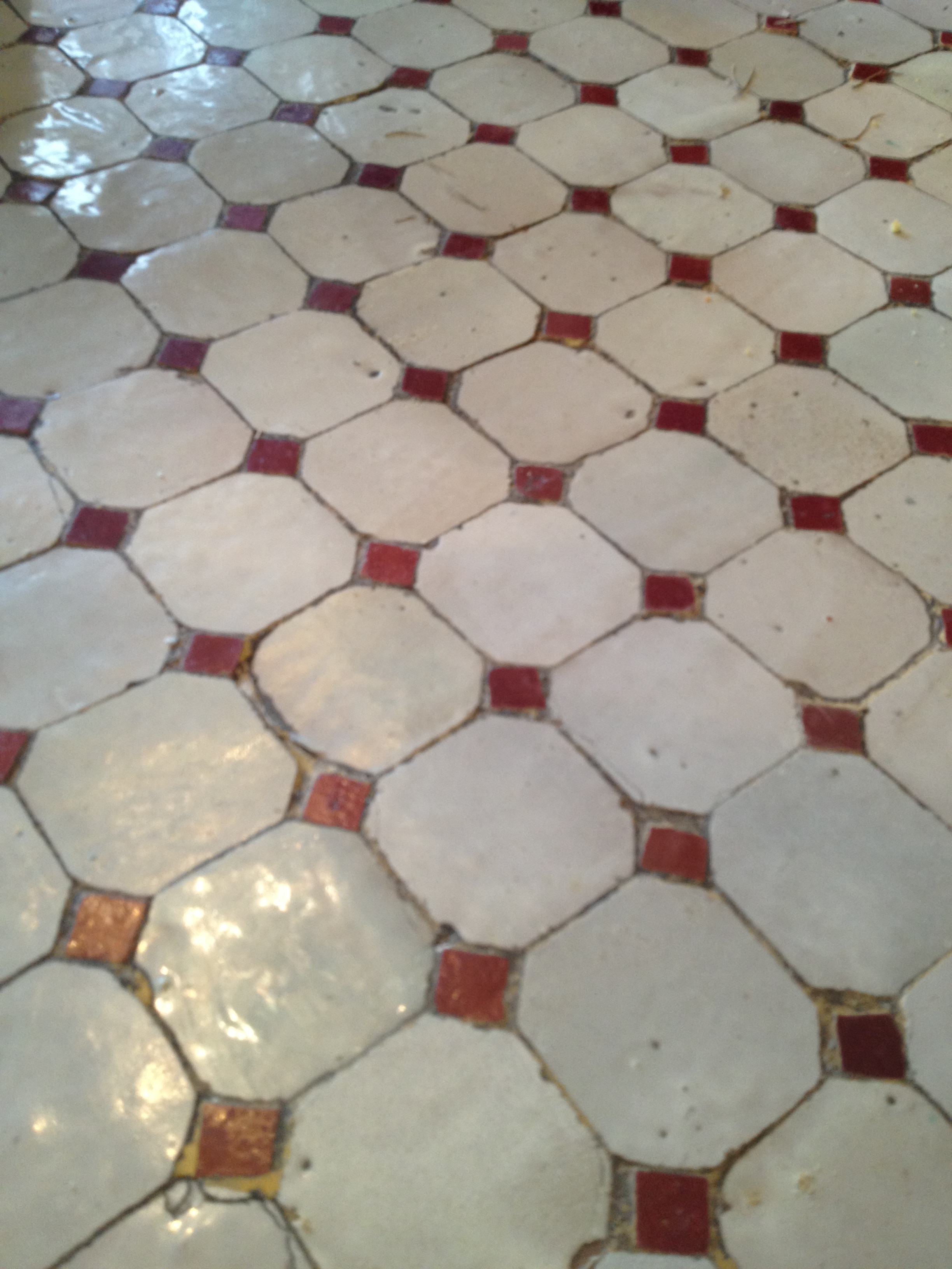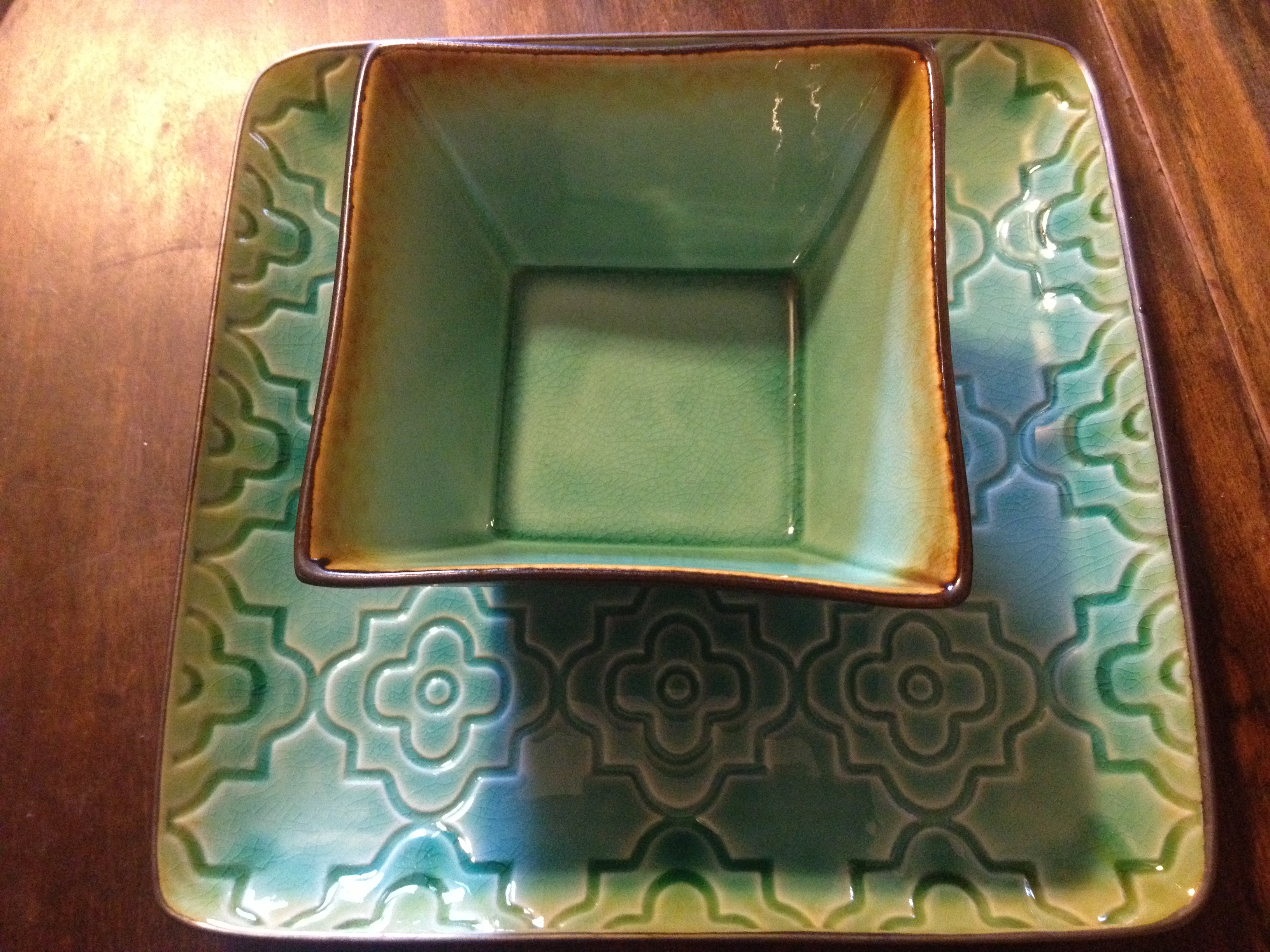 My dishes are all turquoise. I love the way they bring out the palest color blue in the tile on my table.