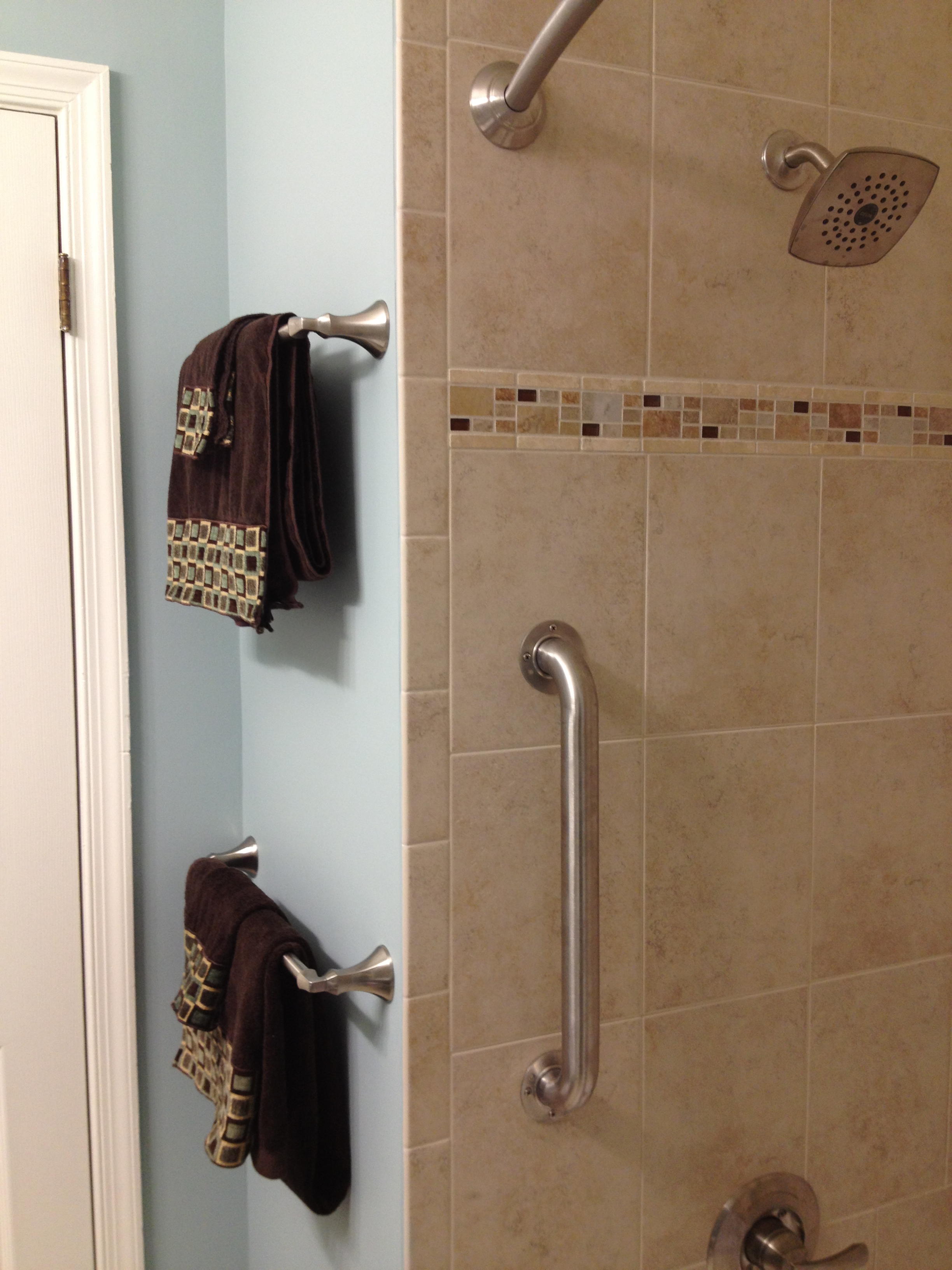The towel bars are hanging on a wall that was cut back about six inches to create space for towels. This space is taken from the adjacent linen closet that opens into the hallway. The added room allows the door to open all the way and helps the bathroom feel much bigger.