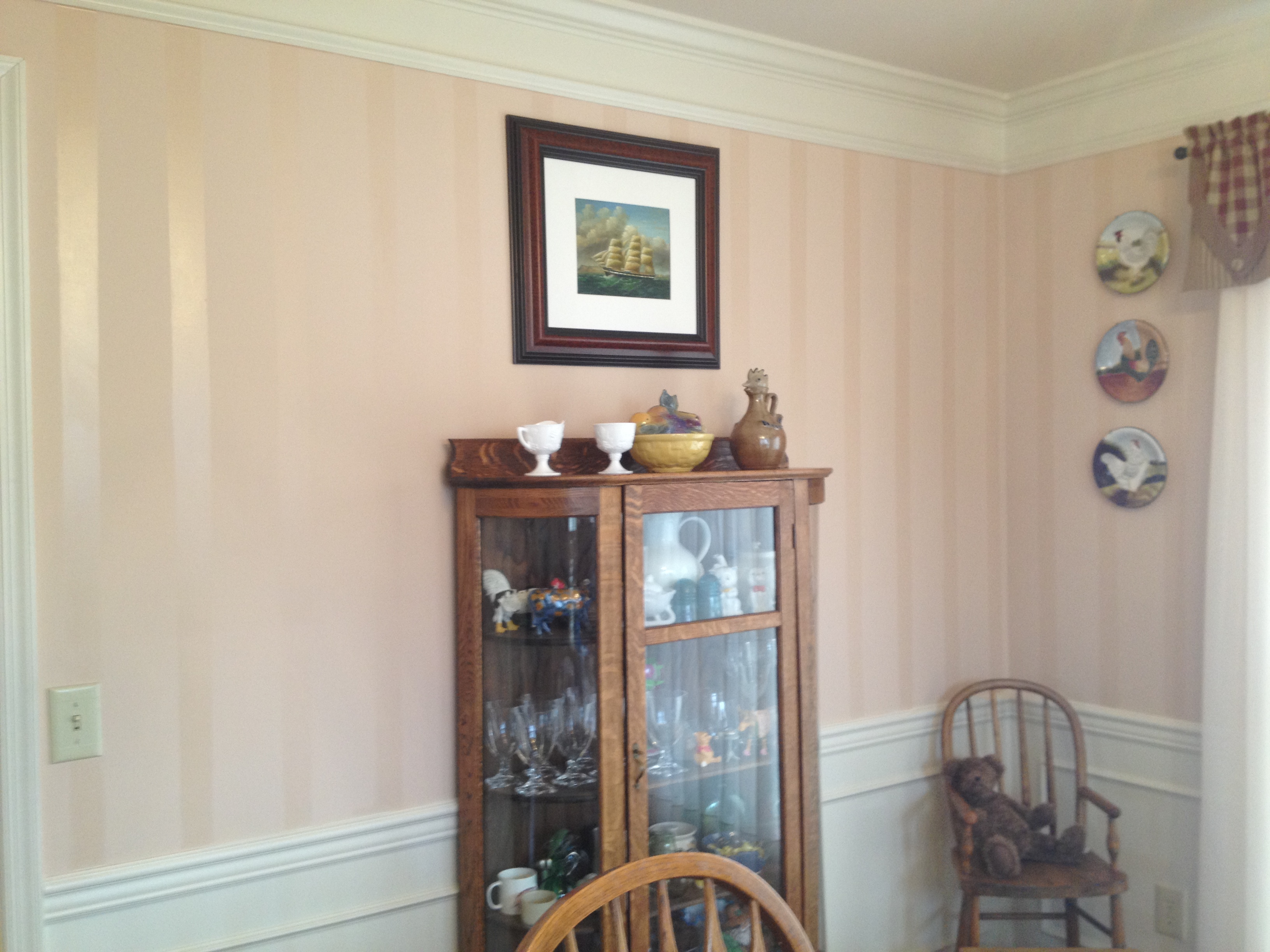 We rearranged the furniture and the homeowner was then inspired to hang some art she had hidden in the basement. A fabulous old woodcut block print of a flag with blue accents, which she hung above the pie safe. I cannot believe this treasure was hiding out in the basement!