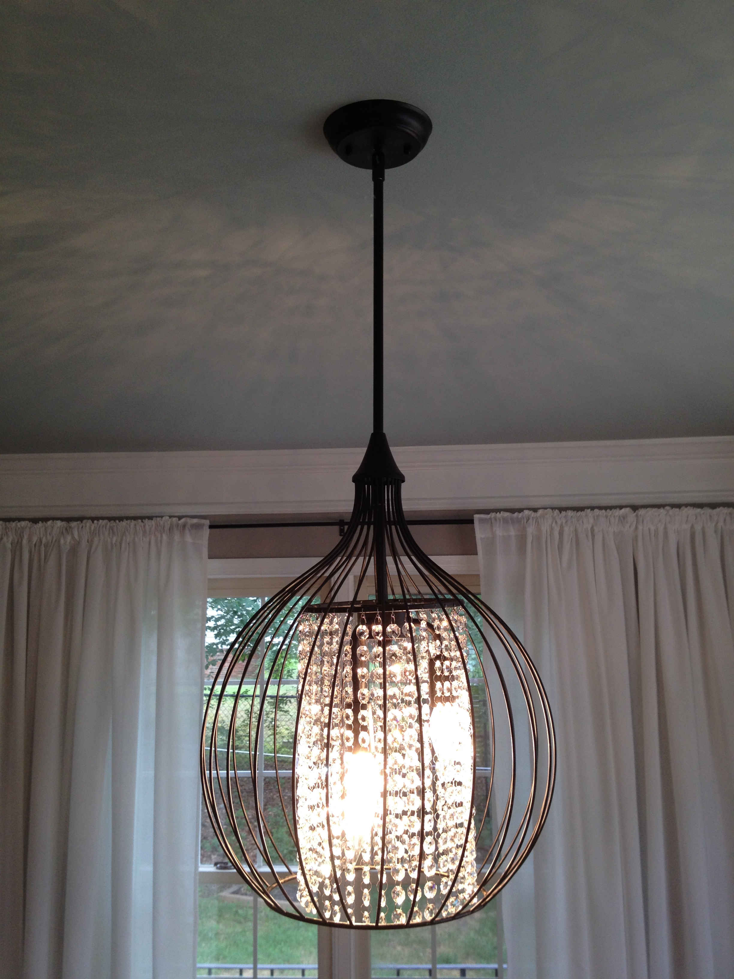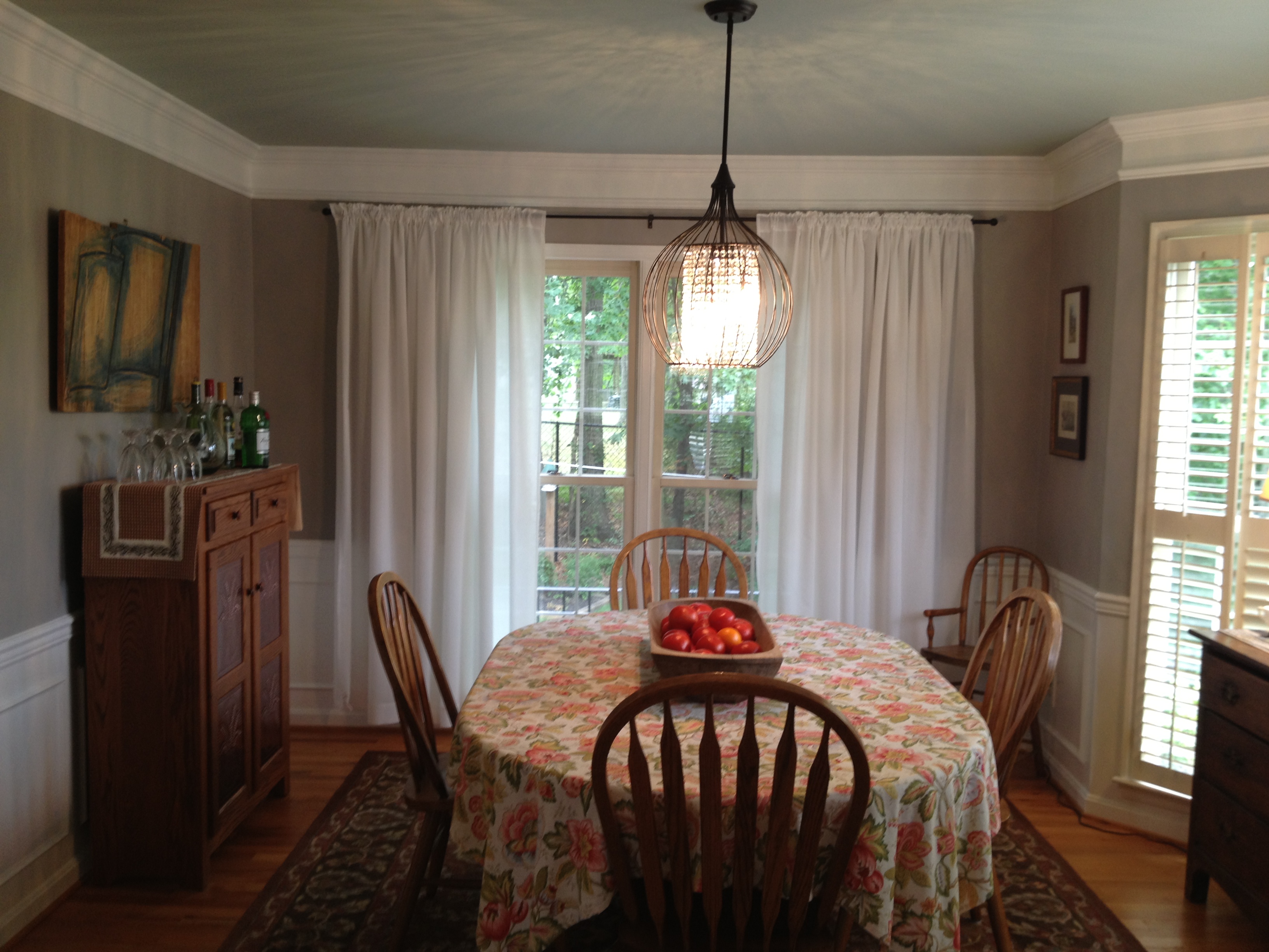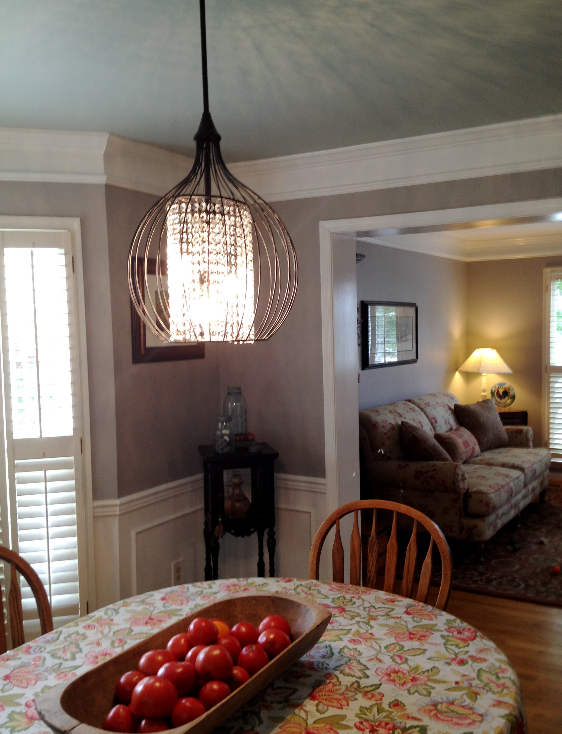 She had to have the chandelier re-centered over the table, because originally the chandelier was installed about 18 inches off-center. This would have caused me to twitch. The new chandelier sparkles, and brings just the right amount of crystal bling into the room, and now, it is even centered.