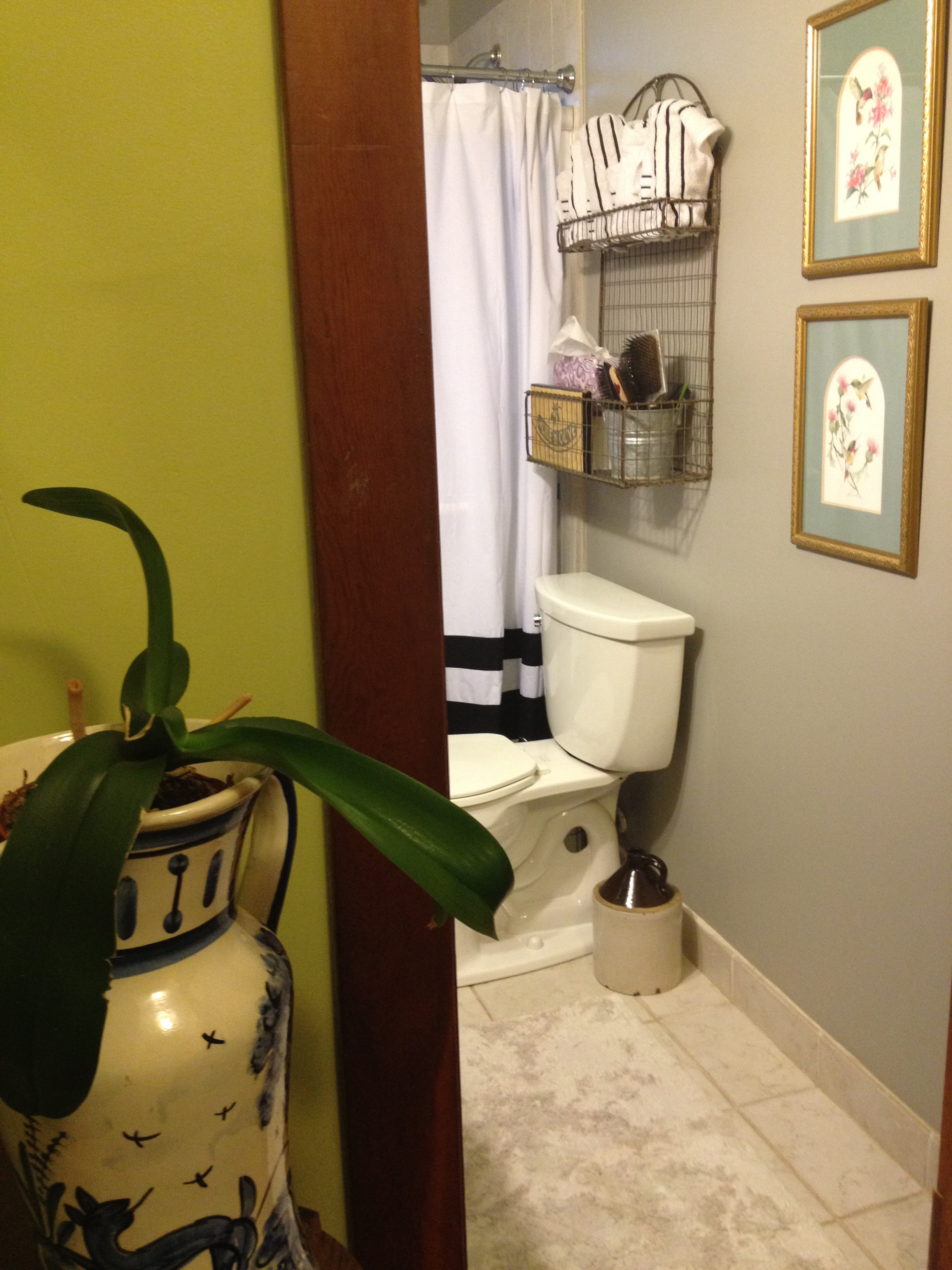 The bathroom is much improved. I am always amazed at what a little thrift store art and paint can do to spruce up a space.