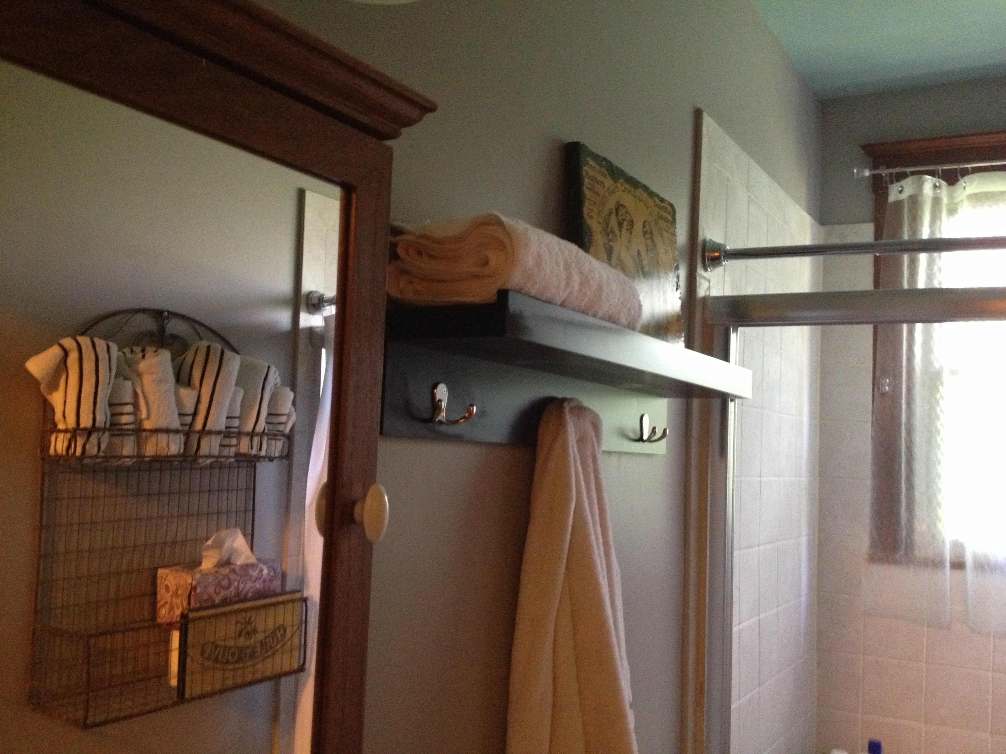I hung a different shelf, that I had bought at Lowe’s at least four months ago for hanging towels, on the opposite wall.