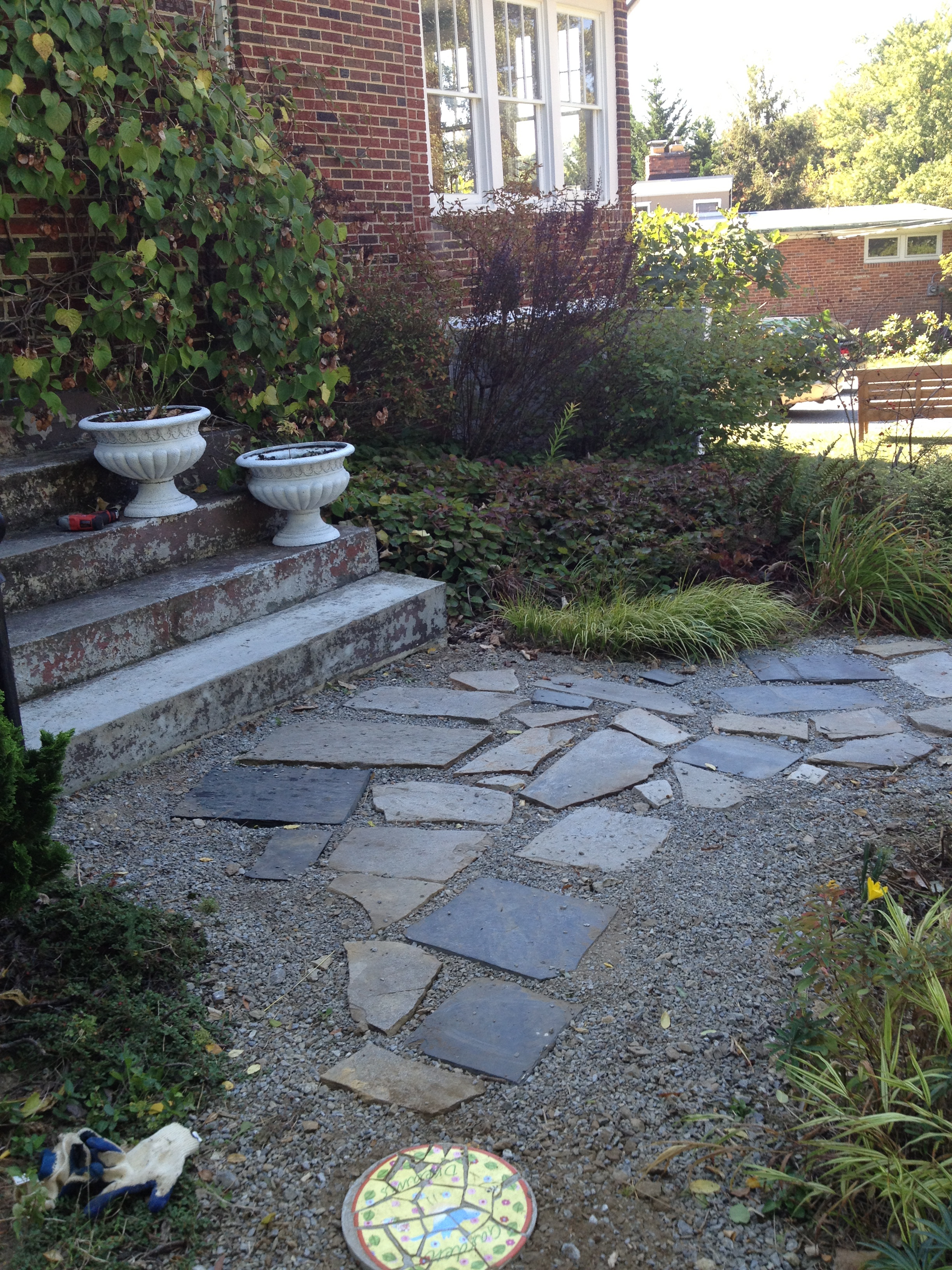 We relocated all of the scattered flagstones around the driveway and imposed order on our surroundings by building a path with them. It looks much better and did I mention this was cheaper than going to the gym?