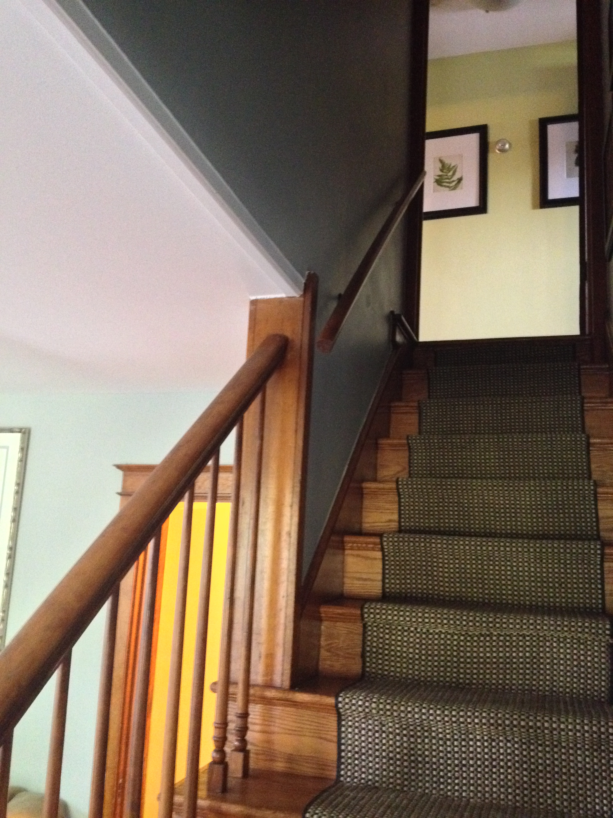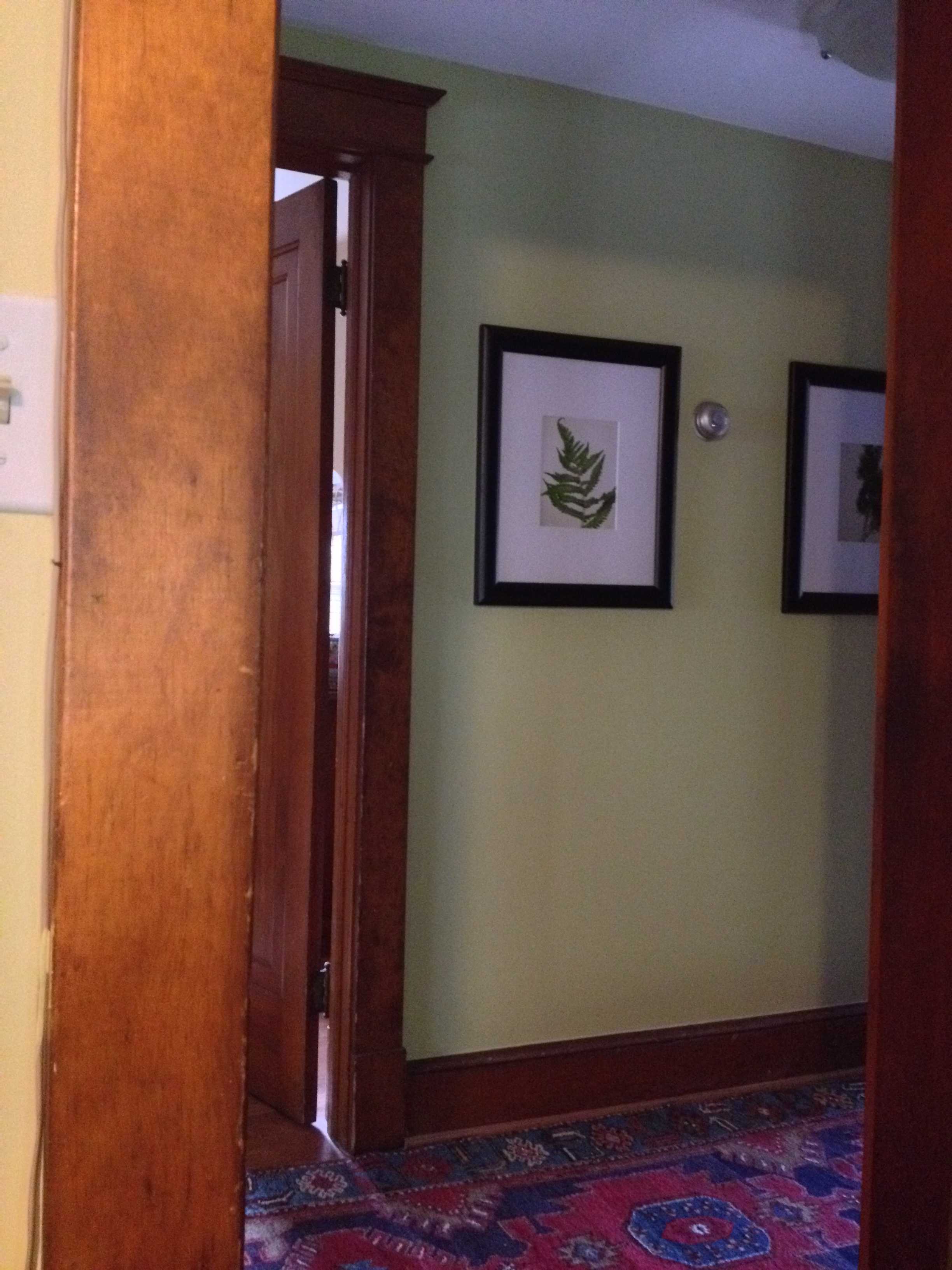 If you stand at the bottom of the stairs, you see the downstairs hallway and the upstairs hallway together, and they complete a color circle as they are both painted in Green Hydrangea. This is an interesting effect and while I am a fan of color, the risk is to use too much or too many different colors in one house. I have achieved a balance here and the amount of color feels just right.