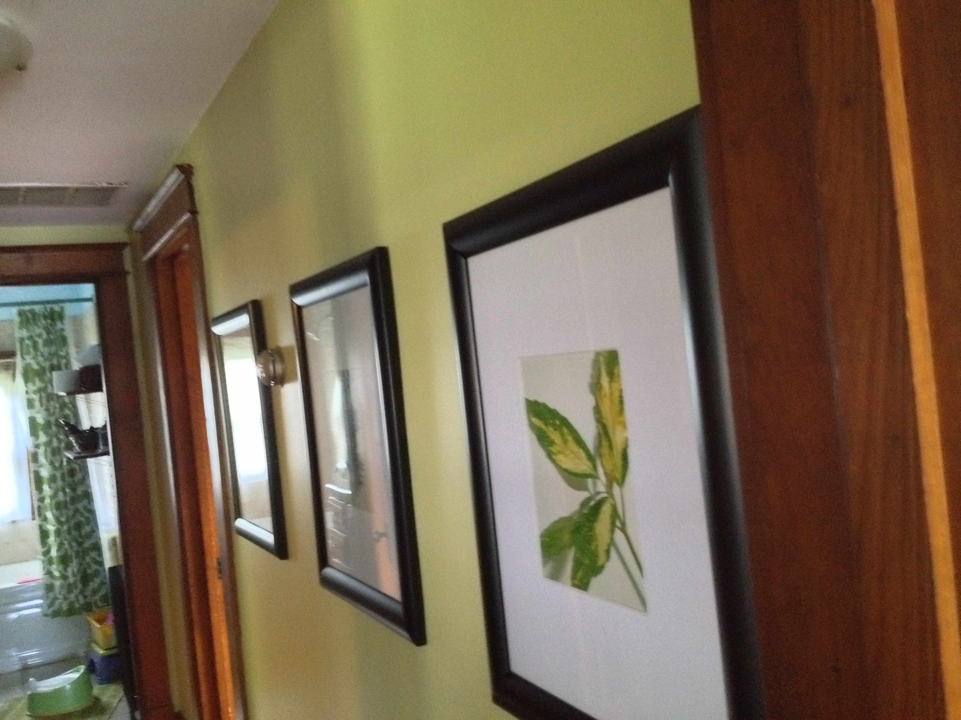 You may recall a post in which I photographed a few botanicals (Budget Botanicals) from my yard. I printed them on photo paper and then framed them for a “gallery style” wall in my upstairs hallway. This hallway is too narrow for any furniture, and dwarfed any of the artwork I had to hang on it. Without any real light coming in, it was also dark.