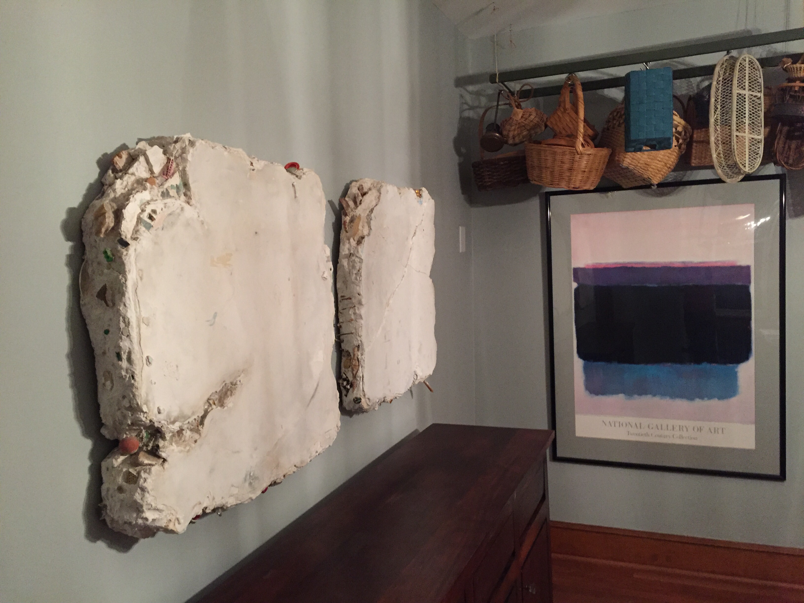 These pieces hanging in my dining room serve as a reminder that art is a living idea, meant to stir up discussion and provoke thought. I see them as a study of our culture through what’s been left behind… Bits of rubbish, a clock, remnants of polite society mixed with cigarettes and bouncy balls, as if fossilized. No matter what, it has stirred up conversation and that is the purpose of art.