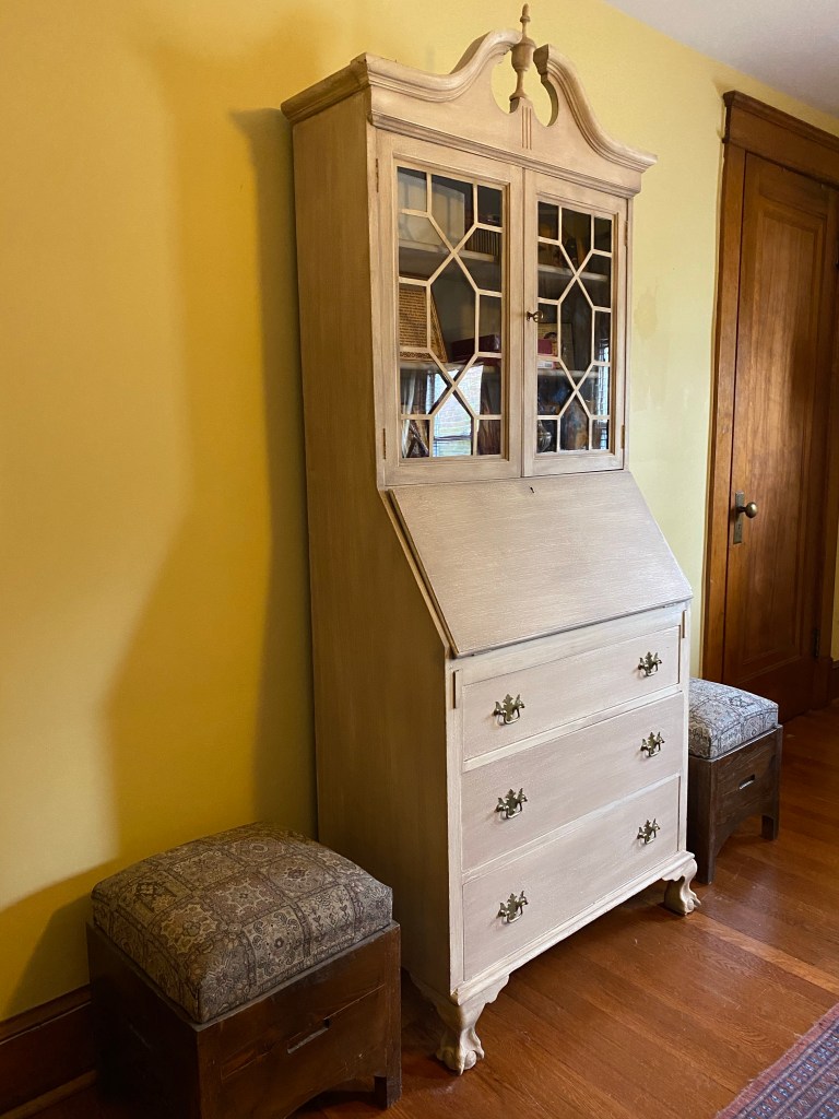There is no plug nearby, or task lighting, so it’s not perfect. I am using the drawers for my clothes and the cushioned stools, which already lived here, are the perfect height to sit and work. I can stash mail, hide the clutter, find a stamp, and after eight years in this house, sit somewhere to write. ๐
