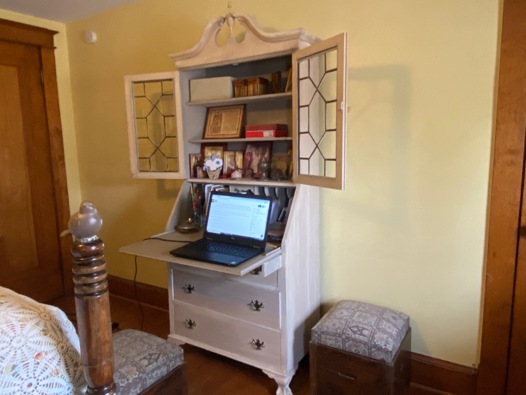 This new highly-coveted space is in my bedroom, and close enough in proximity that I can defend its territory. It’s an old-fashioned secretary desk that I got from my favorite hang-out spot, you know the one I work at, Community Forklift. It is a vintage piece that is chalk-painted with good functionality. I love that the color is camouflage in my bedroom and blends in with the wall, making the room seem larger and preventing any enemy action. I have set up a station of icons on one shelf, to deter anyone from taking over, and make it mine. I have to pray to the saints while I am working, just to get things done, and cannot be left to my own devices. It’s a good system and I have staked my claim.